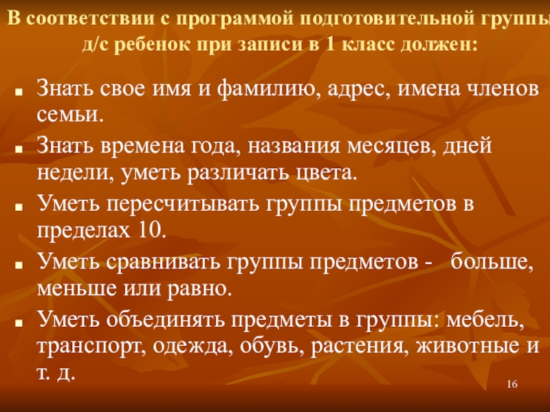 Слайд 16В соответствии с программой подготовительной группы д/с ребенок при записи в