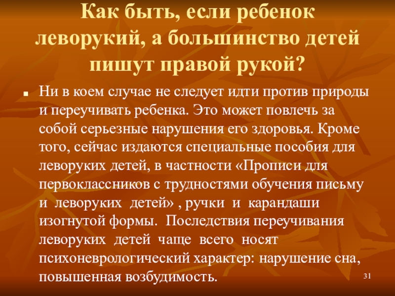 Ни в коем случае не следует идти против природы и переучивать ребенка. Это может повлечь за собой серьезные нарушения его здоровья. Кроме того, сейчас издаются специальные пособия для леворуких детей, в частности «Прописи для первоклассников с трудностями обучения письму и леворуких детей» , ручки и карандаши изогнутой формы. Последствия переучивания леворуких детей чаще всего носят психоневрологический характер: нарушение сна, повышенная возбудимость.