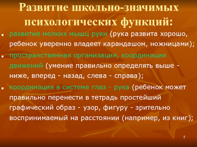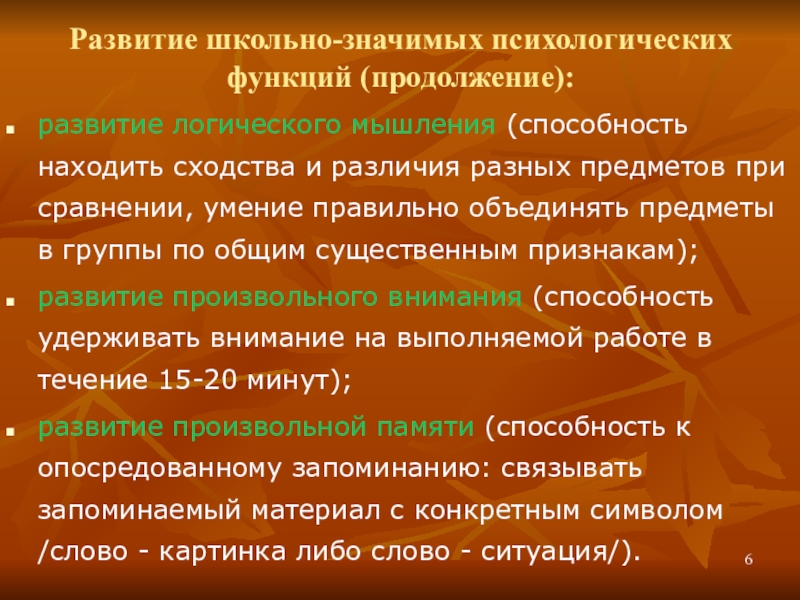 Слайд 6Развитие школьно-значимых психологических функций (продолжение):