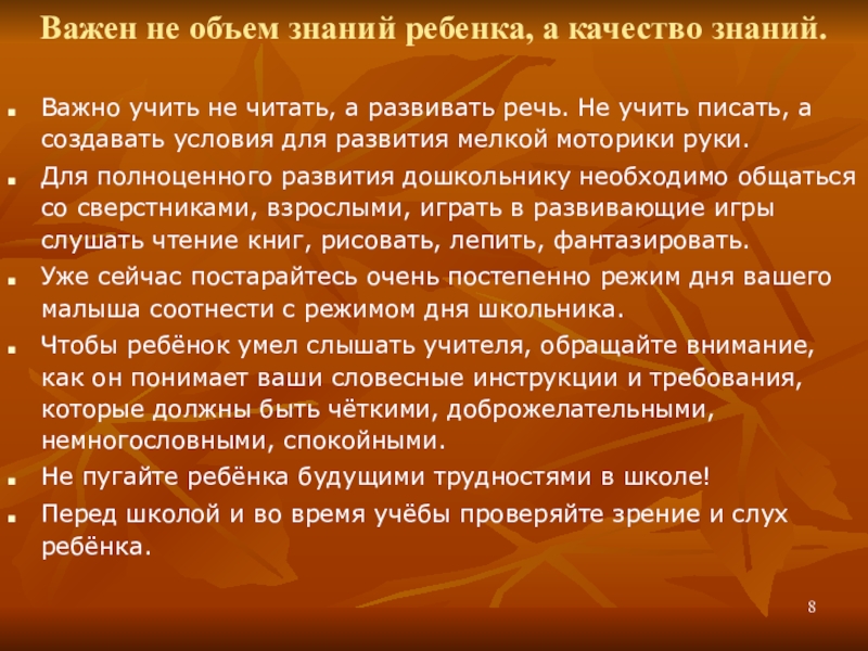 Слайд 8Важен не объем знаний ребенка, а качество знаний.