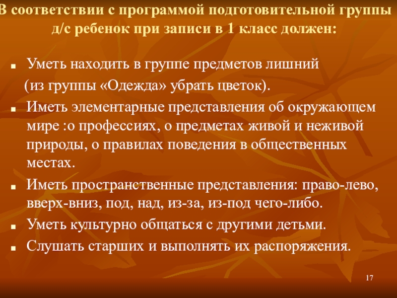 Слайд 17В соответствии с программой подготовительной группы д/с ребенок при записи в