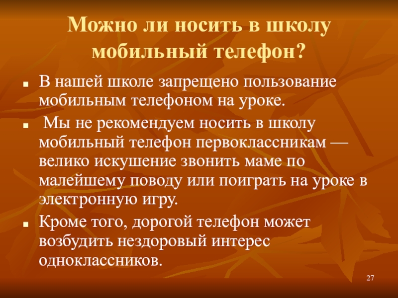 Слайд 27Можно ли носить в школу мобильный телефон?