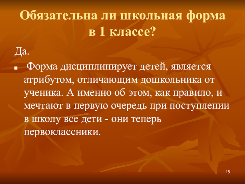 Слайд 19Обязательна ли школьная форма в 1 классе?