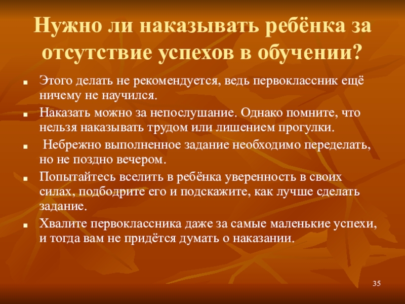 Слайд 35Нужно ли наказывать ребёнка за отсутствие успехов в обучении?