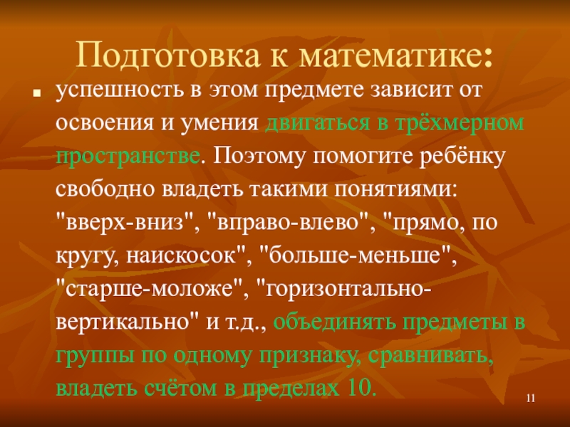 двигаться в трёхмерном пространстве. Поэтому помогите ребёнку свободно владеть такими понятиями: "вверх-вниз", "вправо-влево", "прямо, по кругу, наискосок", "больше-меньше", "старше-моложе", "горизонтально-вертикально" и т.д., объединять предметы в группы по одному признаку, сравнивать, владеть счётом в пределах 10.