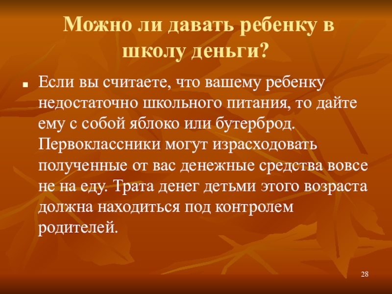 Слайд 28 Можно ли давать ребенку в школу деньги?