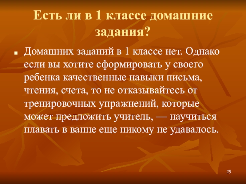 классе нет. Однако если вы хотите сформировать у своего ребенка качественные навыки письма, чтения, счета, то не отказывайтесь от тренировочных упражнений, которые может предложить учитель, — научиться плавать в ванне еще никому не удавалось.