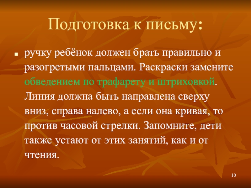 замените обведением по трафарету и штриховкой. Линия должна быть направлена сверху вниз, справа налево, а если она кривая, то против часовой стрелки. Запомните, дети также устают от этих занятий, как и от чтения.