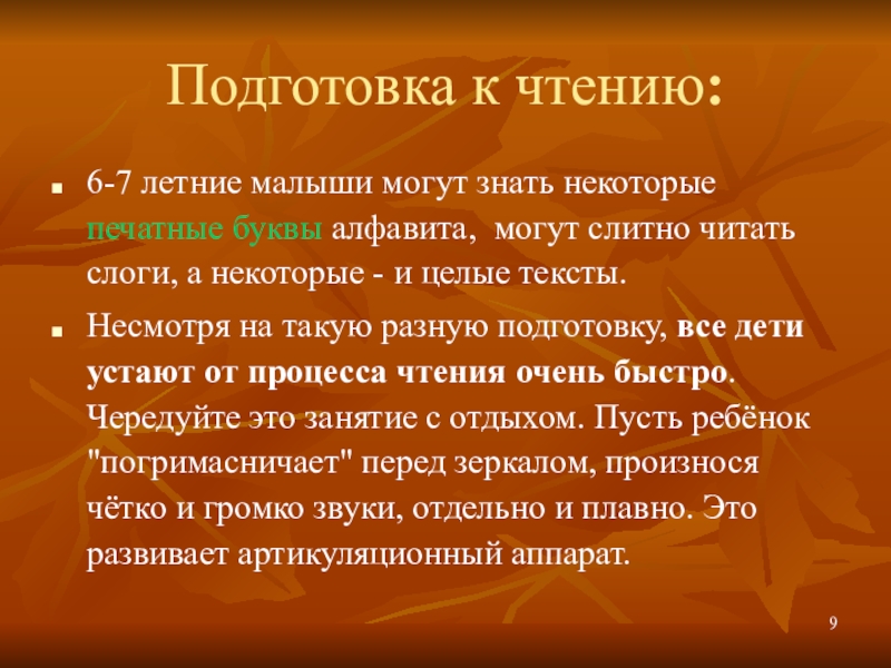 Несмотря на такую разную подготовку, все дети устают от процесса чтения очень быстро. Чередуйте это занятие с отдыхом. Пусть ребёнок "погримасничает" перед зеркалом, произнося чётко и громко звуки, отдельно и плавно. Это развивает артикуляционный аппарат.