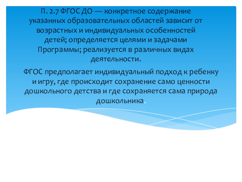 П. 2.7 ФГОС ДО — конкретное содержание указанных образовательных областей зависит от возрастных и индивидуальных особенностей детей; определяется целями и задачами Программы; реализуется в различных видах деятельности.
