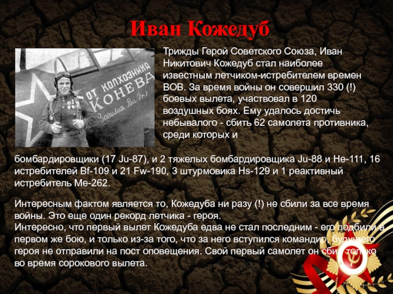 Интересно, что первый вылет Кожедуба едва не стал последним - его подбили в первом же бою, и только из-за того, что за него вступился командир, будущего героя не отправили на пост оповещения. Свой первый самолет он сбил только во время сорокового вылета.