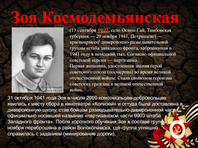 31 октября 1941 года Зоя в числе 2000 комсомольцев-добровольцев явилась к месту сбора в кинотеатре «Колизей» и оттуда была доставлена в диверсионную школу, став бойцом разведывательно-диверсионной части, официально носившей название «партизанской части 9903 штаба Западного фронта». После короткого обучения Зоя в составе группы была 4 ноября переброшена в район Волоколамска, где группа успешно справилась с заданием (минирование дороги).