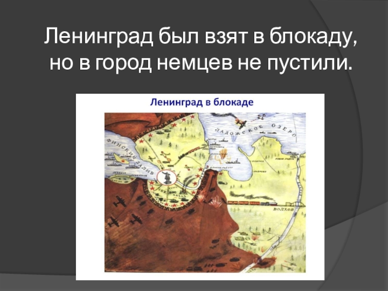 Слайд 9Ленинград был взят в блокаду, но в город немцев не пустили.