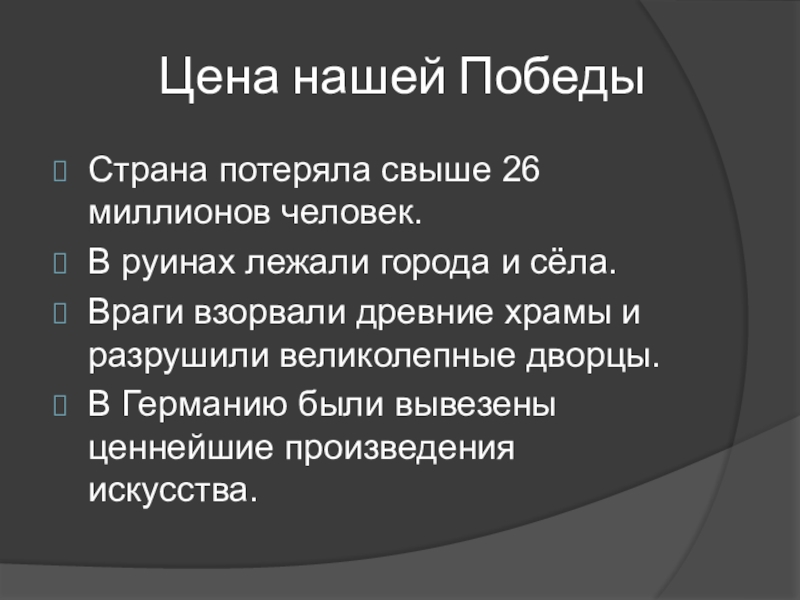 Цена нашей ПобедыСтрана потеряла свыше 26 миллионов человек.В руинах лежали города и сёла.Враги взорвали древние храмы и