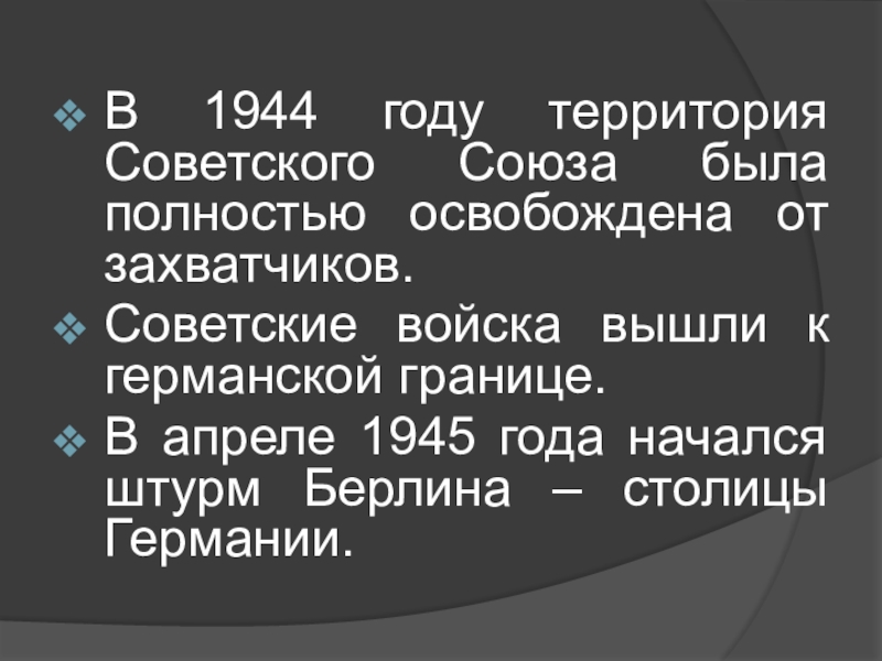 В 1944 году территория Советского Союза была полностью освобождена от захватчиков.Советские войска вышли к германской границе.В апреле