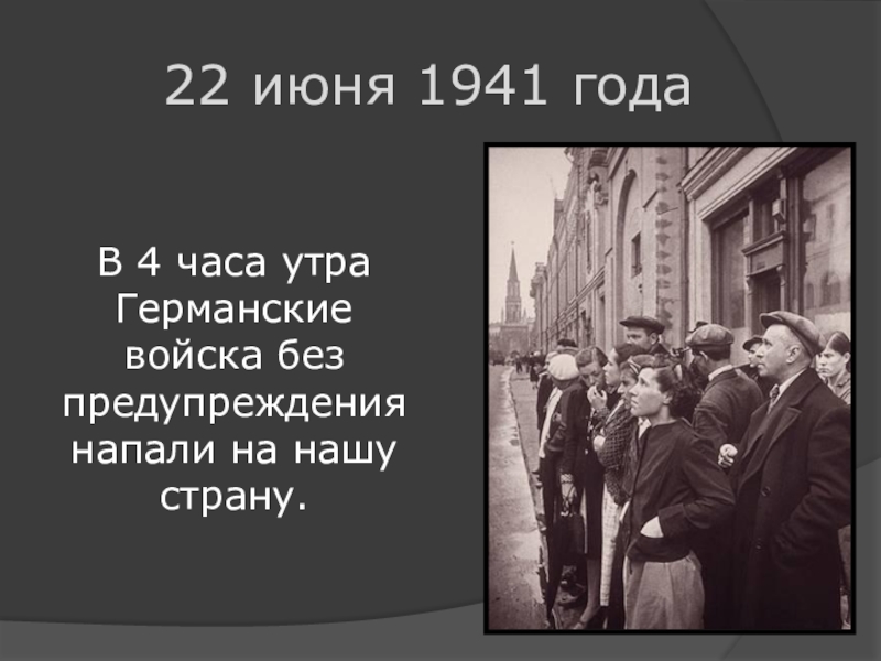 22 июня 1941 годаВ 4 часа утра Германские войска без предупреждения напали на нашу страну.