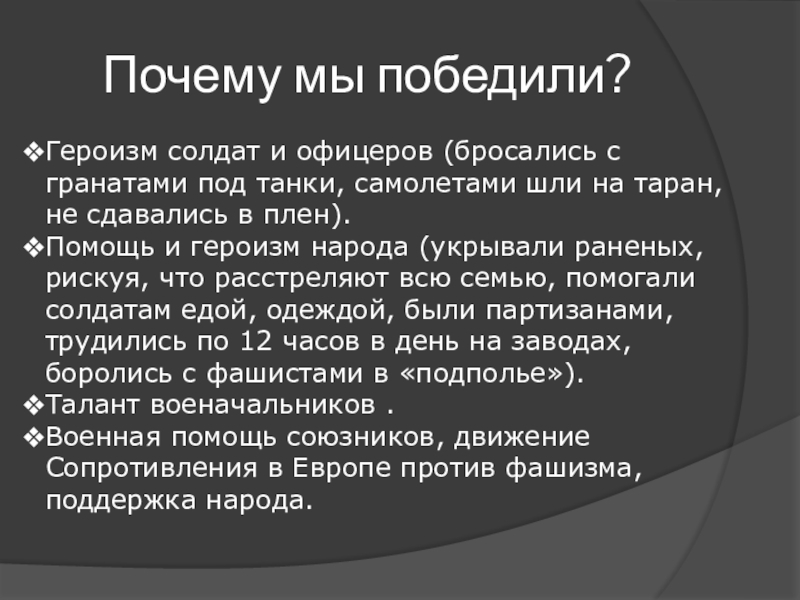 Почему мы победили?Героизм солдат и офицеров (бросались с гранатами под танки, самолетами шли на таран, не сдавались