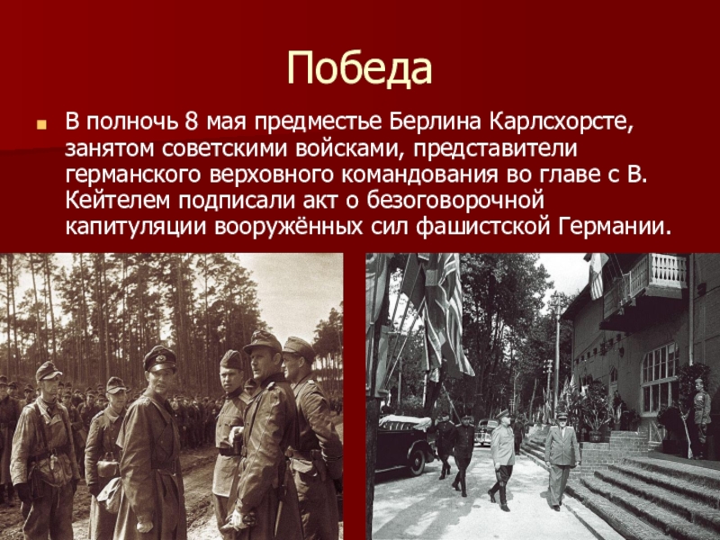 германского верховного командования во главе с В. Кейтелем подписали акт о безоговорочной капитуляции вооружённых сил фашистской Германии.