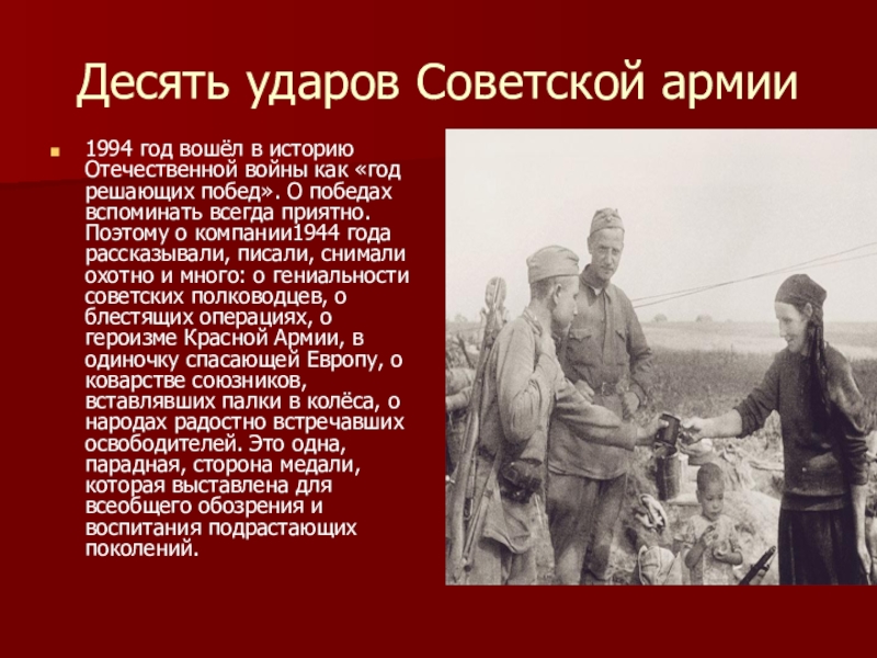 «год решающих побед». О победах вспоминать всегда приятно. Поэтому о компании1944 года рассказывали, писали, снимали охотно и много: о гениальности советских полководцев, о блестящих операциях, о героизме Красной Армии, в одиночку спасающей Европу, о коварстве союзников, вставлявших палки в колёса, о народах радостно встречавших освободителей. Это одна, парадная, сторона медали, которая выставлена для всеобщего обозрения и воспитания подрастающих поколений.