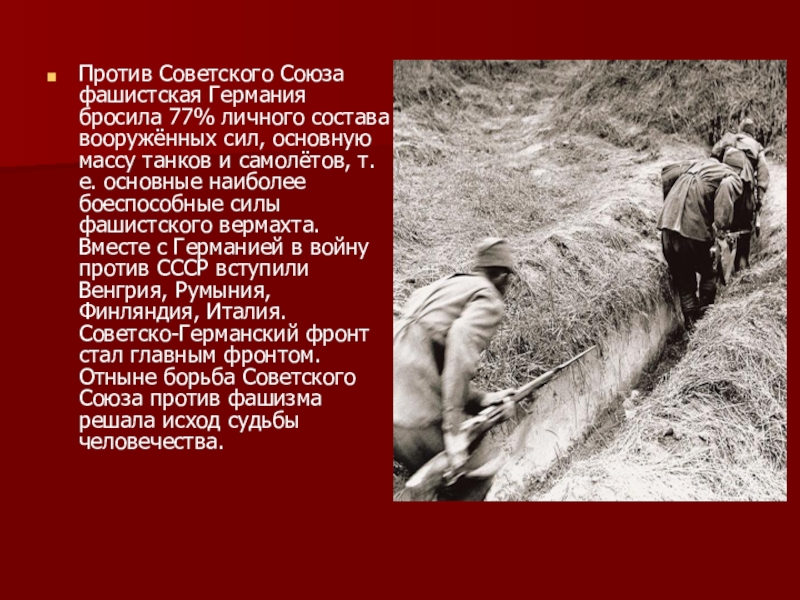основную массу танков и самолётов, т.е. основные наиболее боеспособные силы фашистского вермахта. Вместе с Германией в войну против СССР вступили Венгрия, Румыния, Финляндия, Италия. Советско-Германский фронт стал главным фронтом. Отныне борьба Советского Союза против фашизма решала исход судьбы человечества.
