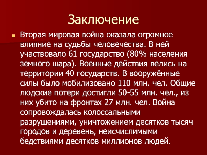 участвовало 61 государство (80% населения земного шара). Военные действия велись на территории 40 государств. В вооружённые силы было мобилизовано 110 млн. чел. Общие людские потери достигли 50-55 млн. чел., из них убито на фронтах 27 млн. чел. Война сопровождалась колоссальными разрушениями, уничтожением десятков тысяч городов и деревень, неисчислимыми бедствиями десятков миллионов людей.