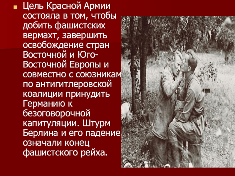 освобождение стран Восточной и Юго-Восточной Европы и совместно с союзниками по антигитлеровской коалиции принудить Германию к безоговорочной капитуляции. Штурм Берлина и его падение означали конец фашистского рейха.