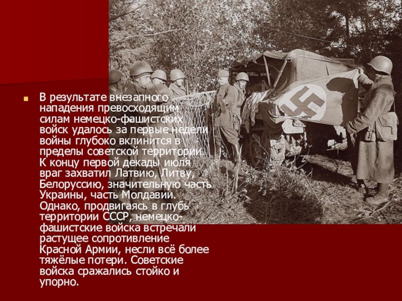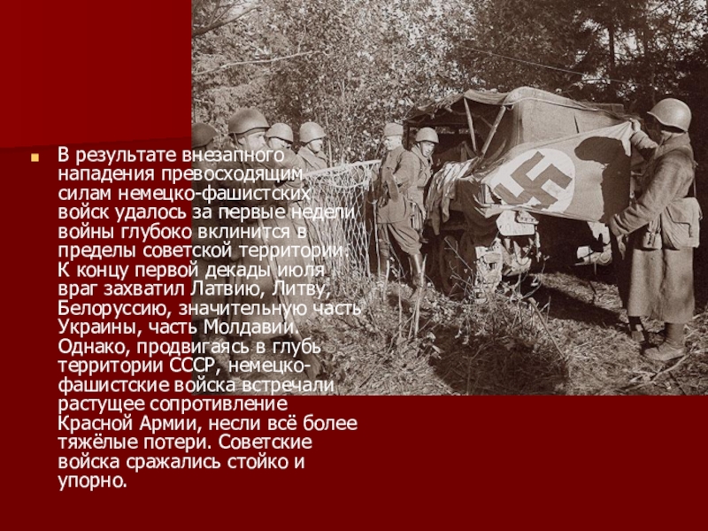 Слайд 4В результате внезапного нападения превосходящим силам немецко-фашистских войск удалось за первые