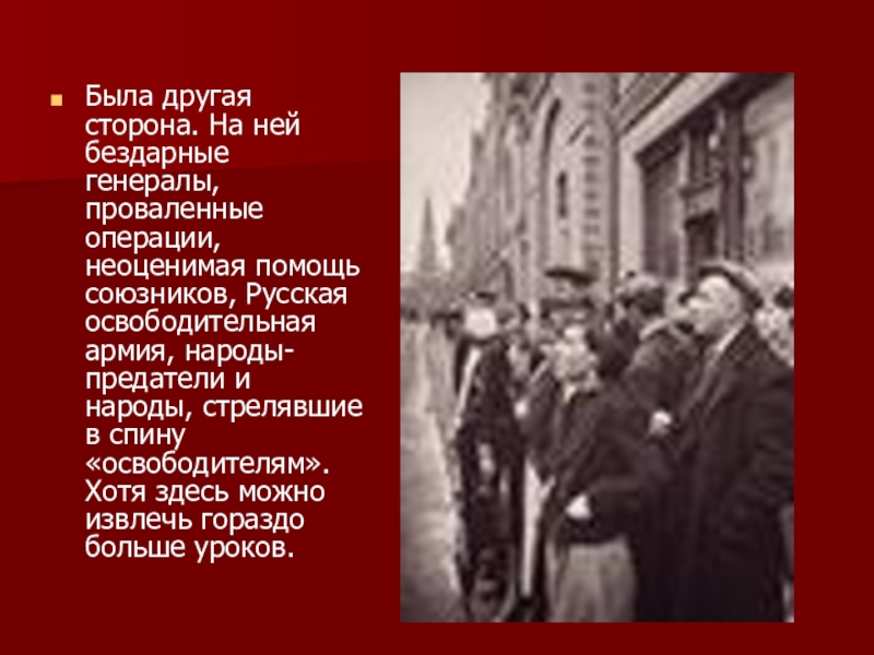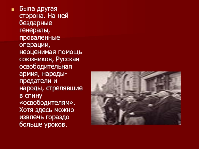 Слайд 8Была другая сторона. На ней бездарные генералы, проваленные операции, неоценимая помощь