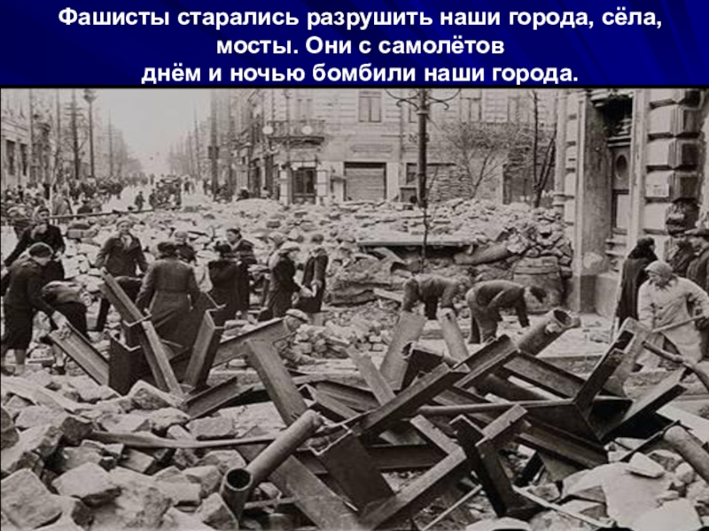 Слайд 11Фашисты старались разрушить наши города, сёла, мосты. Они с самолётов
