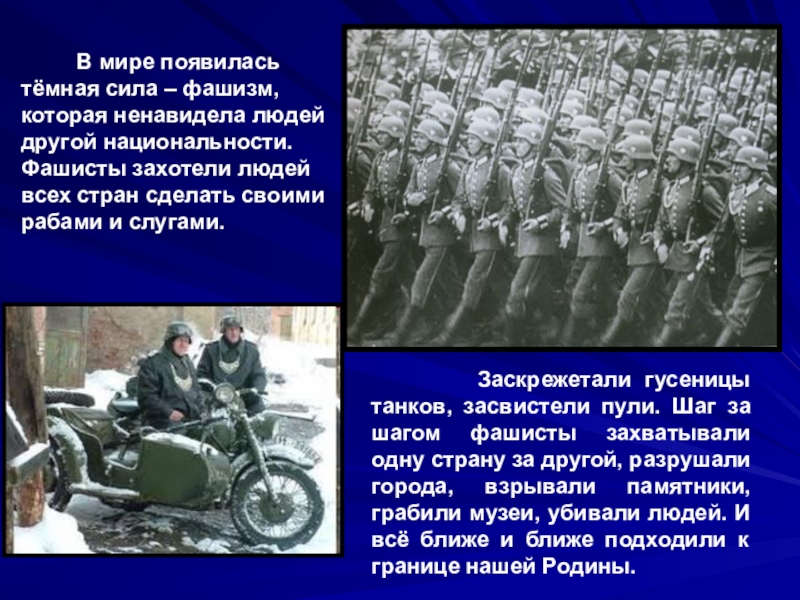 фашизм, которая ненавидела людей другой национальности. Фашисты захотели людей всех стран сделать своими рабами и слугами.