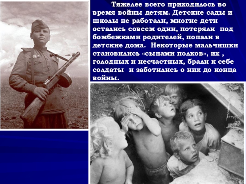 детям. Детские сады и школы не работали, многие дети остались совсем одни, потеряли под бомбежками родителей, попали в детские дома. Некоторые мальчишки становились «сынами полков», их , голодных и несчастных, брали к себе солдаты и заботились о них до конца войны.