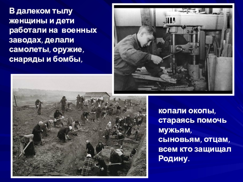 Слайд 19В далеком тылу женщины и дети работали на военных заводах, делали