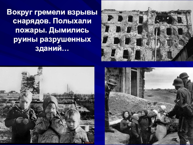 Слайд 12Вокруг гремели взрывы снарядов. Полыхали пожары. Дымились руины разрушенных зданий…