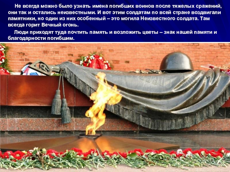 после тяжелых сражений, они так и остались неизвестными. И вот этим солдатам по всей стране воздвигали памятники, но один из них особенный – это могила Неизвестного солдата. Там всегда горит Вечный огонь.