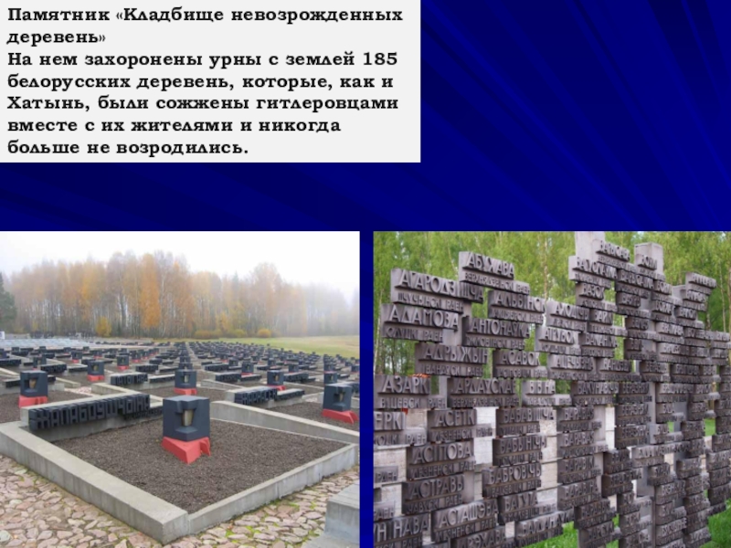 белорусских деревень, которые, как и Хатынь, были сожжены гитлеровцами вместе с их жителями и никогда больше не возродились.