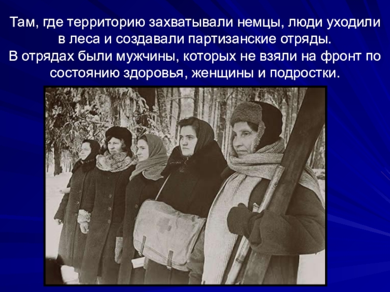 Слайд 23Там, где территорию захватывали немцы, люди уходили в леса и создавали
