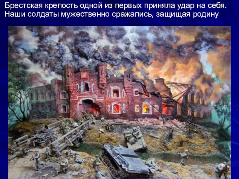 Слайд 4Брестская крепость одной из первых приняла удар на себя. Наши солдаты