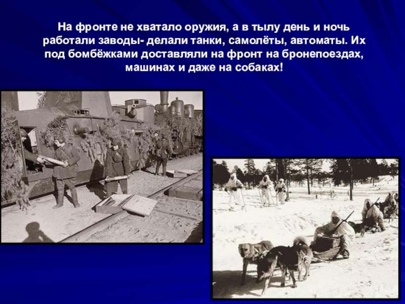 работали заводы- делали танки, самолёты, автоматы. Их под бомбёжками доставляли на фронт на бронепоездах, машинах и даже на собаках!
