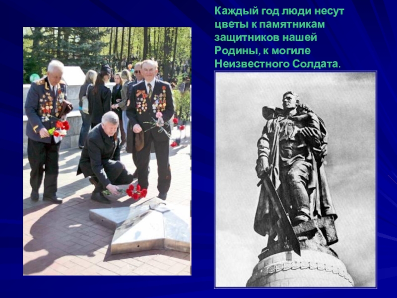 Слайд 40Каждый год люди несут цветы к памятникам защитников нашей Родины, к