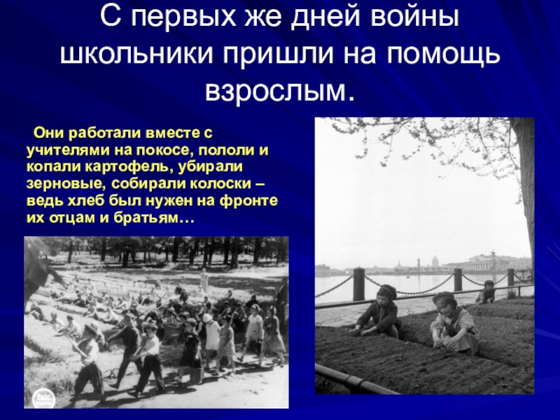 Слайд 22С первых же дней войны школьники пришли на помощь взрослым.