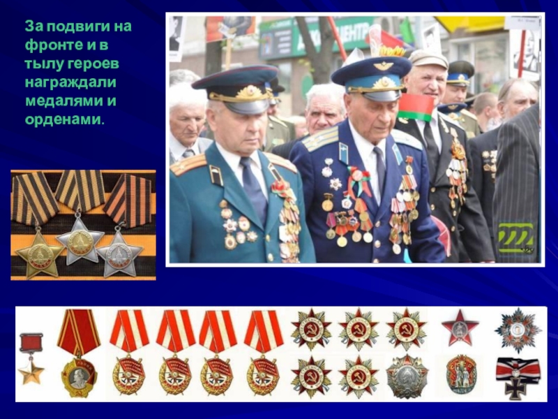 Слайд 33За подвиги на фронте и в тылу героев награждали медалями и