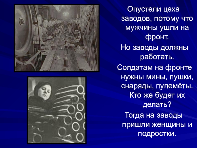 Слайд 18Опустели цеха заводов, потому что мужчины ушли на фронт.