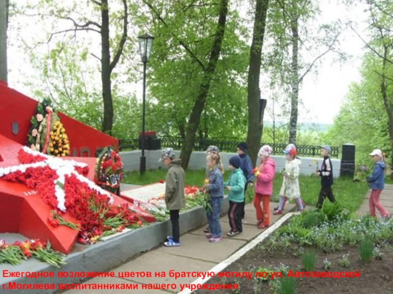 Слайд 42Ежегодное возложение цветов на братскую могилу по ул. Автозаводской г.Могилева воспитанниками