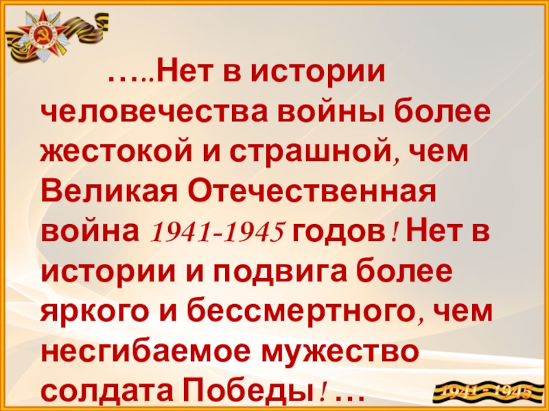 …..Нет в истории человечества войны более жестокой и страшной, чем Великая Отечественная война 1941-1945 годов! Нет в истории и подвига более яркого и бессмертного, чем несгибаемое мужество солдата Победы! …