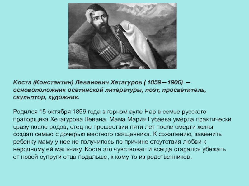 Коста (Константин) Леванович Хетагуров ( 1859—1906) — основоположник осетинской литературы, поэт, просветитель, скульптор, художник.