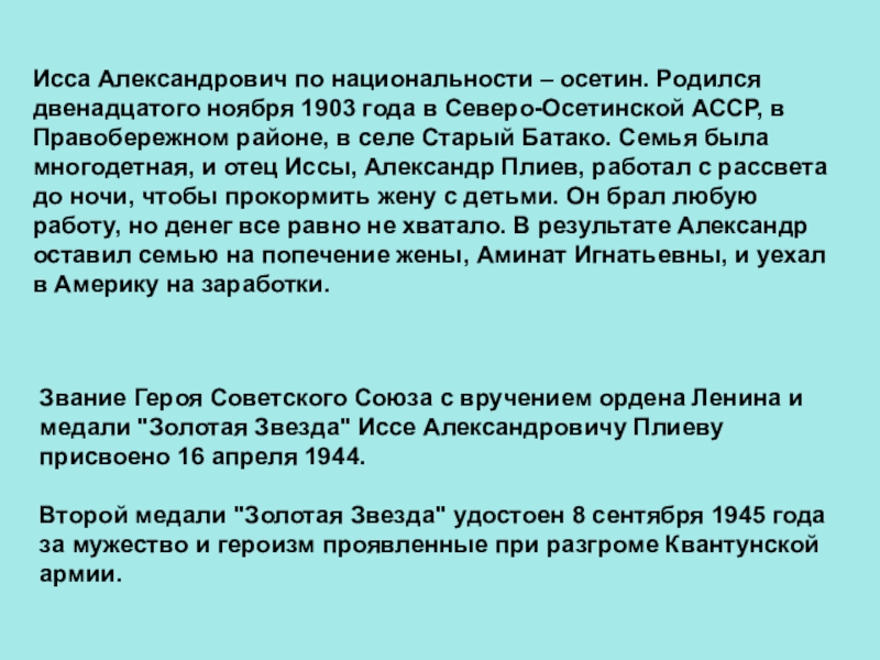 Звание Героя Советского Союза с вручением ордена Ленина и медали "Золотая Звезда" Иссе Александровичу Плиеву присвоено 16 апреля 1944.
