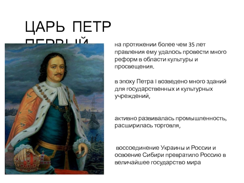 ЦАРЬ ПЕТР ПЕРВЫЙна протяжении более чем 35 лет правления ему удалось провести много реформ в области культуры