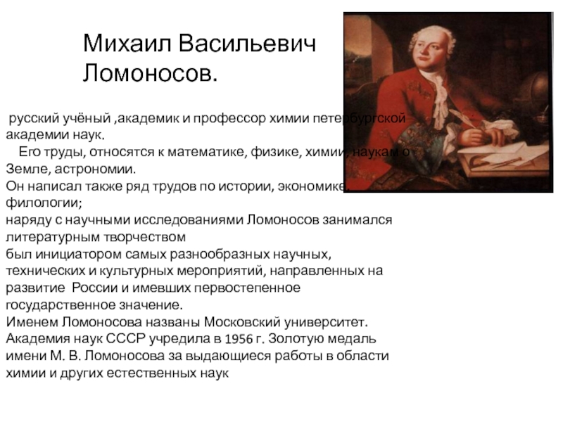 Михаил Васильевич Ломоносов. русский учёный ,академик и профессор химии петербургской академии наук.   Его труды,