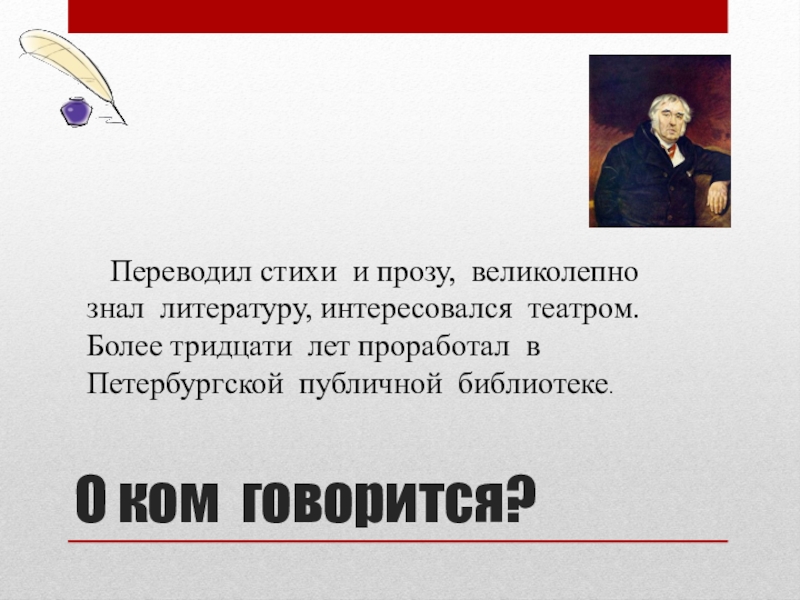 О ком говорится?  Переводил стихи и прозу, великолепно знал литературу, интересовался театром. Более тридцати лет проработал