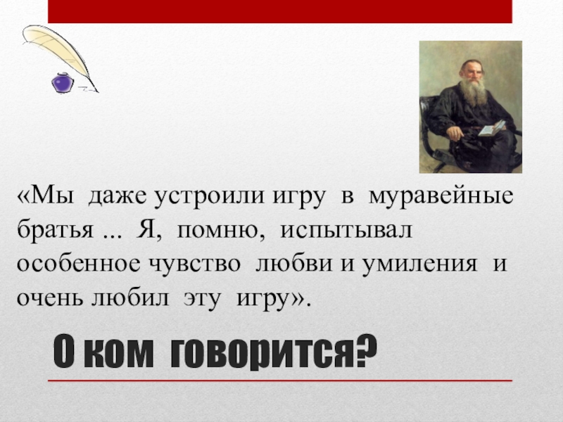 О ком говорится?«Мы даже устроили игру в муравейные братья ... Я, помню, испытывал особенное чувство любви и умиления и очень любил эту игру».